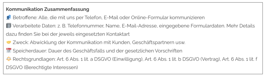 • Art. 6 Abs. 1 lit. f DSGVO (Berechtigte Interessen): Wir wollen Kundenanfragen und geschäftliche Kommunikation in einem professionellen Rahmen betreiben. Dazu sind gewisse technische Einrichtungen wie z. B. E-Mail-Programme, Exchange-Server und Mobilfunkbetreiber notwendig, um die Kommunikation effizient betreiben zu können.