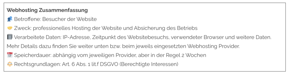 Die Rechtmäßigkeit der Verarbeitung personenbezogener Daten im Rahmen des Webhosting ergibt sich aus Art. 6 Abs. 1 lit. f DSGVO (Wahrung der berechtigten Interessen), denn die Nutzung von professionellem Hosting bei einem Provider ist notwendig, um das Unternehmen im Internet sicher und nutzerfreundlich präsentieren und Angriffe und Forderungen hieraus gegebenenfalls verfolgen zu können.