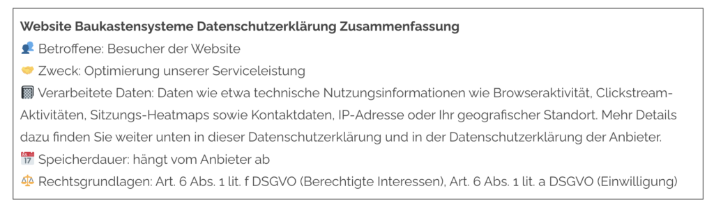 Wir haben ein berechtigtes Interesse daran, ein Website Baukastensystem zu verwenden, um unseren Online-Service zu optimieren und für Sie effizient und nutzeransprechend darzustellen. Die dafür entsprechende Rechtsgrundlage ist Art. 6 Abs. 1 lit. f DSGVO (Berechtigte Interessen). Wir setzen den Baukasten gleichwohl nur ein, soweit Sie eine Einwilligung erteilt haben.