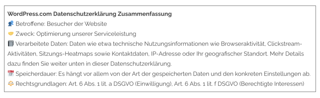 Mehr Details zur Datenschutzrichtlinie und welche Daten auf welche Art durch WordPress verarbeitet werden, finden Sie auf https://automattic.com/privacy/.
